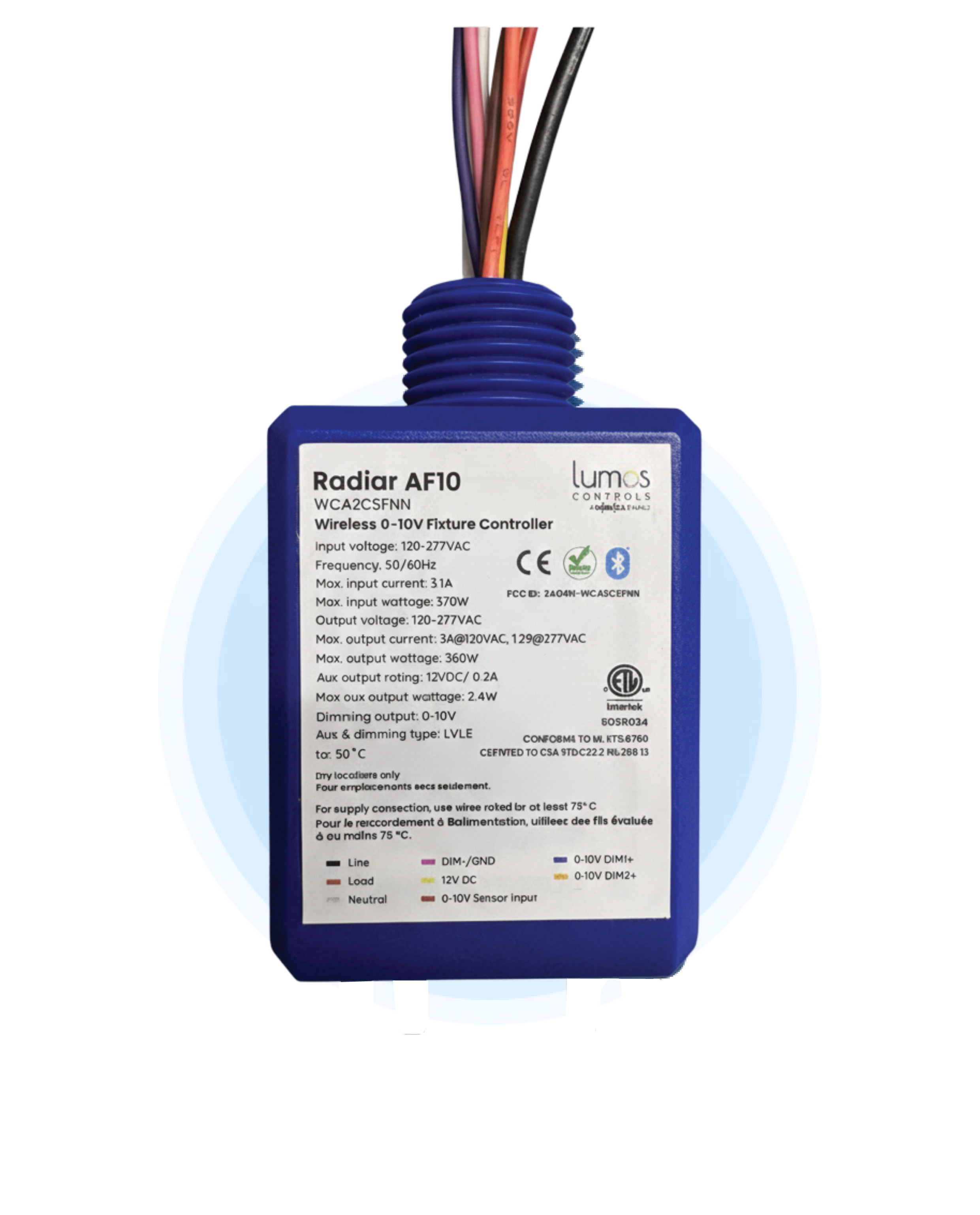Radiar AF10 is a dual-channel dimming/tunable AC fixture controller. The device is easy to mount in an electrical junction box or compatible fixtures. The device has dual channel 0-10V independent output to control intensity and correlated color temperature(CCT). It has a 0-10 VDC input channel and 12VDC aux output to integrate with third-party sensors. It also has a 3A relay for load control.