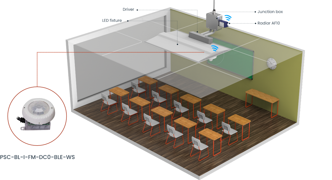 PSC-BL-I-FM-DC0-BLE-WS is a compact, 12-24VDC powered sensor with low bay PIR motion detection. With an easy installation process, it offers 0-10V dimming control and supports UART interface, making it ideal for various indoor and outdoor applications.